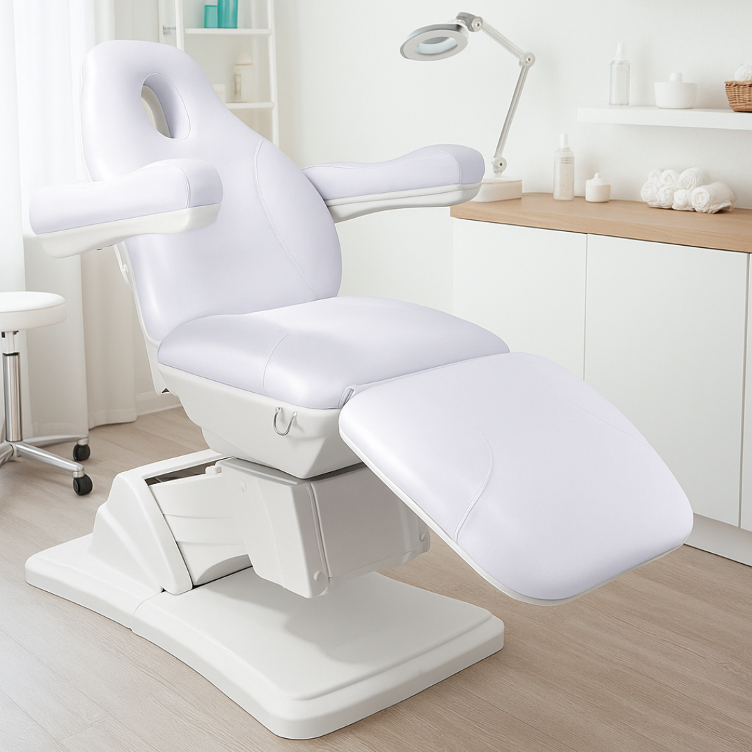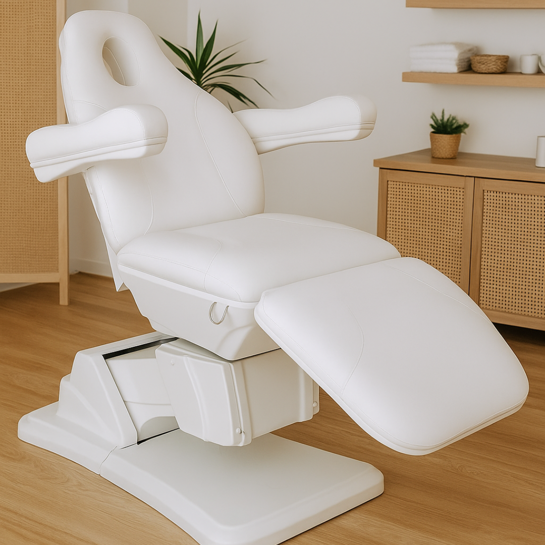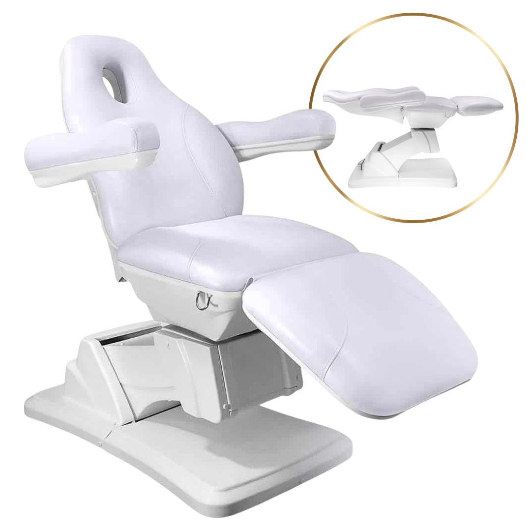 Profesjonalny fotel kosmetyczny. Posiada otwór w zagłówku. Wykonany z wysokiej jakości skóry ekologicznej łatwo zmywalnej. Fotel posiada elektrycznie sterowaną wysokość, regulację oparcia i podnóżka oraz kąt podparcia siedzenia Sterowanie pilotem ułatwia pracę. Usytuowany na stabilnej podstawie. Siedzisko idealnie wyprofilowane z podłokietnikami. Idealne do gabinetów kosmetycznych, Spa, masażu. Łatwy w obsłudze. Dostępny w białym kolorze. Podłokietniki wyjmowane.
