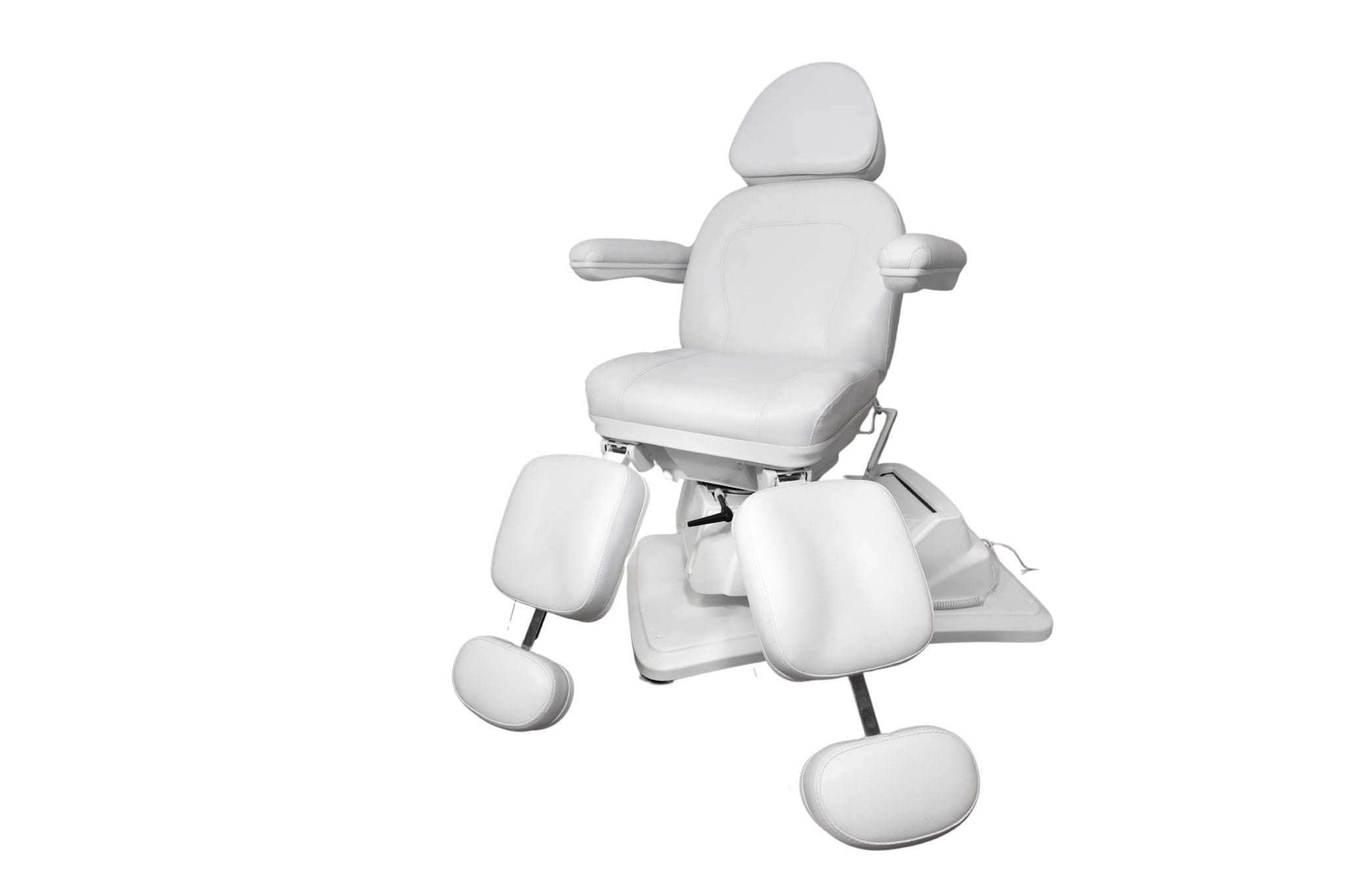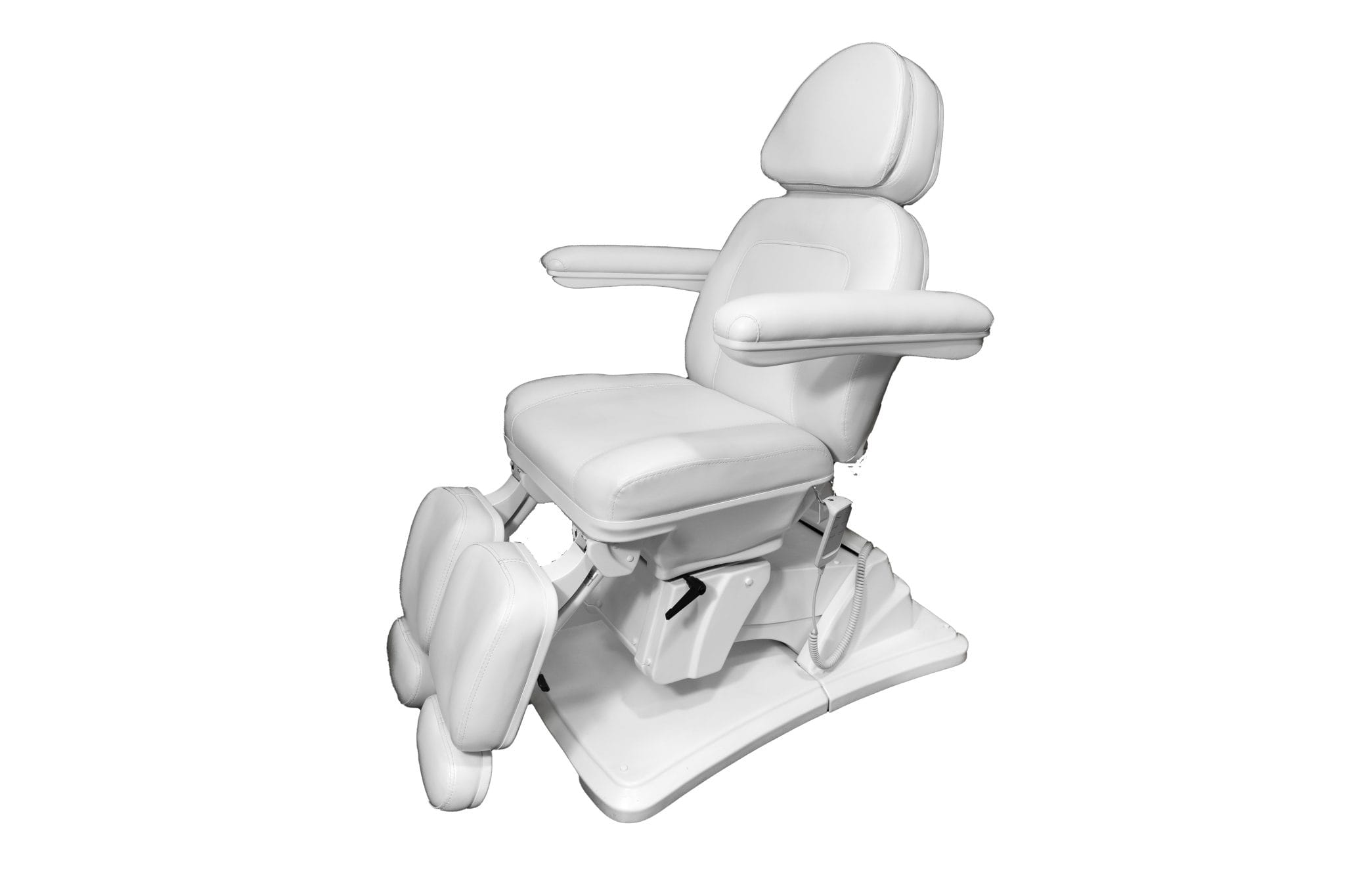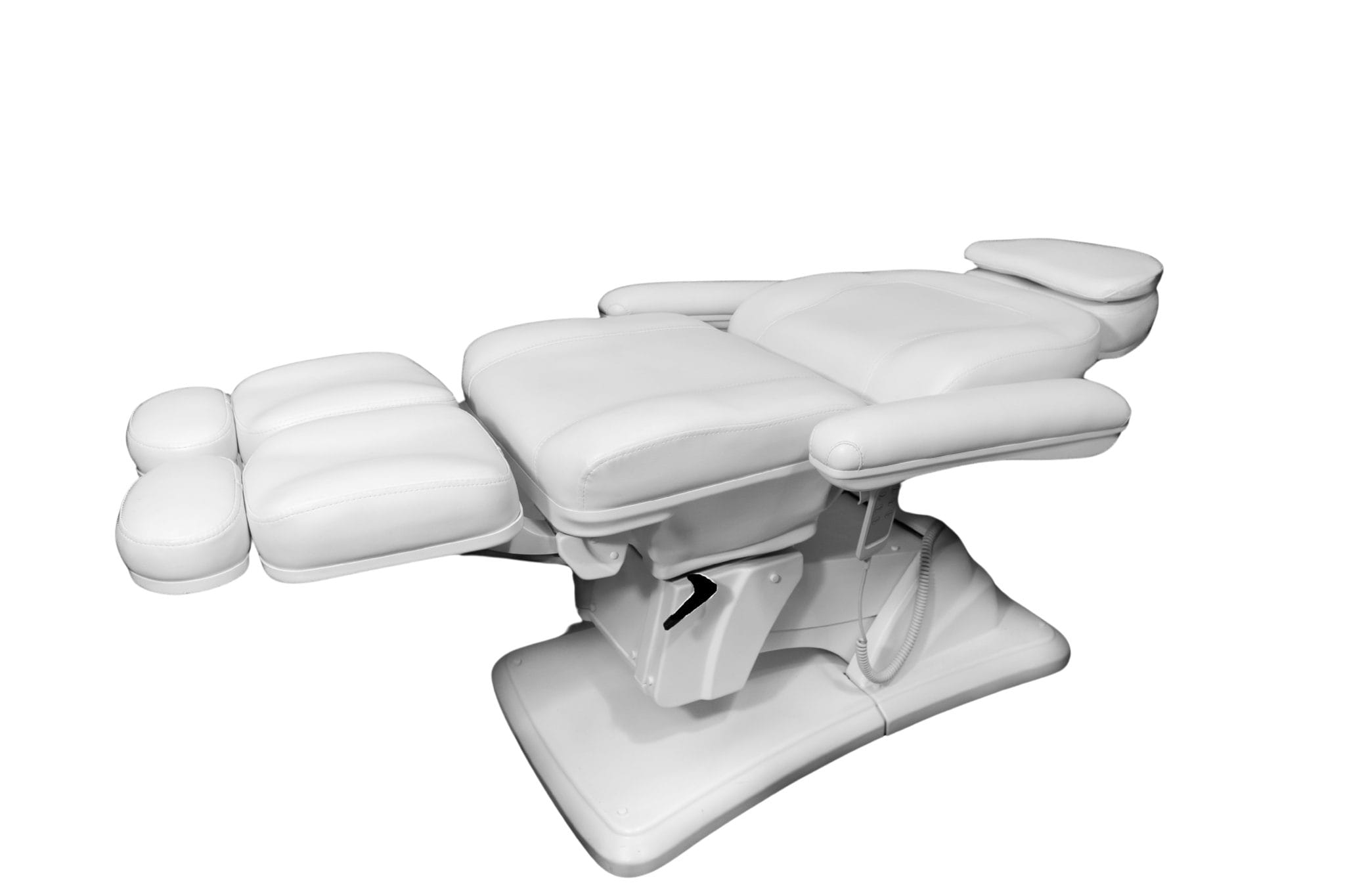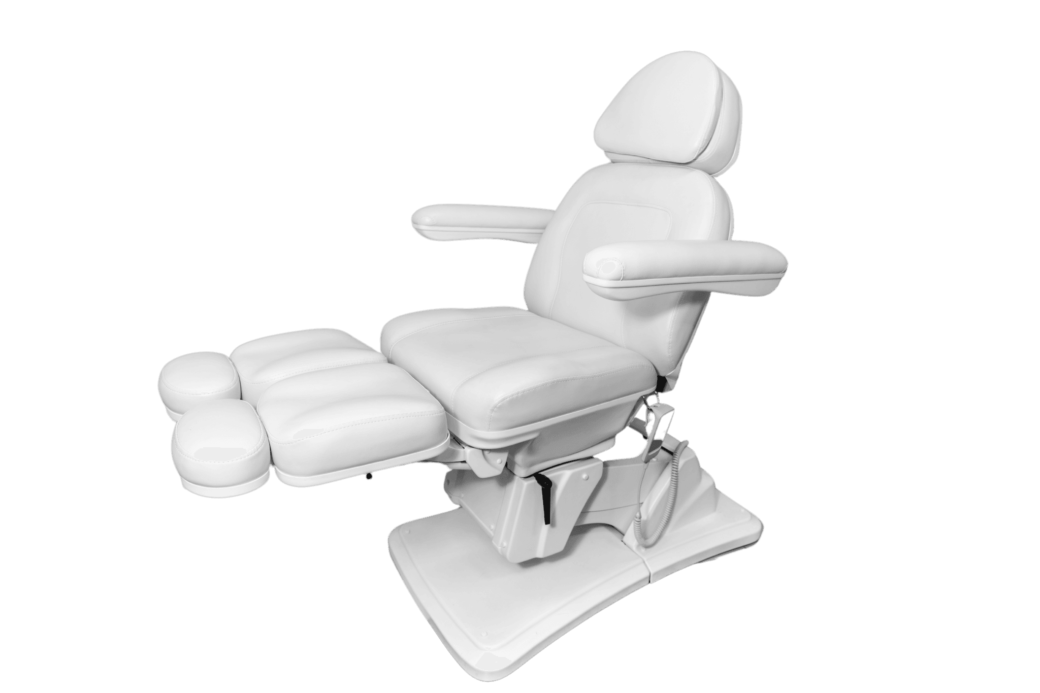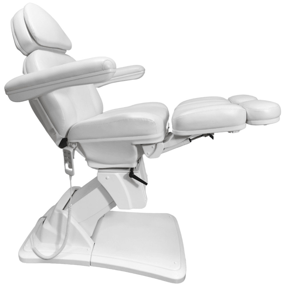 To, co go wyróżnia, to funkcjonalność elektryczna zapewniająca sterowanie bez wysiłku za pomocą intuicyjnego pilota połączonego kablem. Za jego pomocą wyregulujesz wysokość fotela i kąt oparcia. Trzeci silnik odpowiada za funkcję kołyski, co wraz z ręcznie regulowanymi podnóżkami pozwala dobrać idealną pozycję uwzględniając różne zabiegi i zapewniając optymalną wygodę dla klienta.