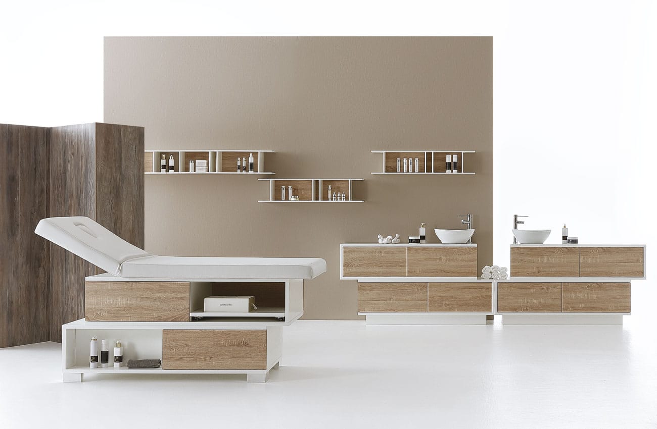 Łóżko do masażu wykonane z błyszczącej białej płyty melaminowanej z detalami dostępnymi w trzech różnych wykończeniach(dąb bardolino, modrzew biały, wenge).