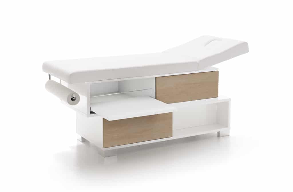 Łóżko jest wyposażone w dwie szuflady, wysuwaną półkę na sprzęt kosmetyczny, dwie ekspozycyjne przegródki na produkty, dużą komorę na sprzęt, podkłady, koc elektryczny itp.