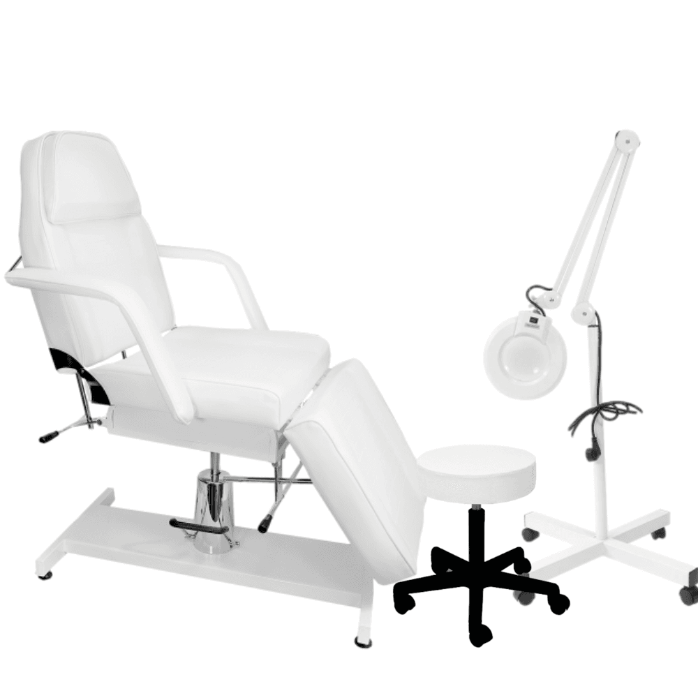 Zestaw do wyposażenia gabinetu: Fotel kosmetyczny hydrauliczny CLASSIC+ Lampa Lupa 5dpi 22W Basic+ Taboret kosmetyczny Basic bez oparcia
