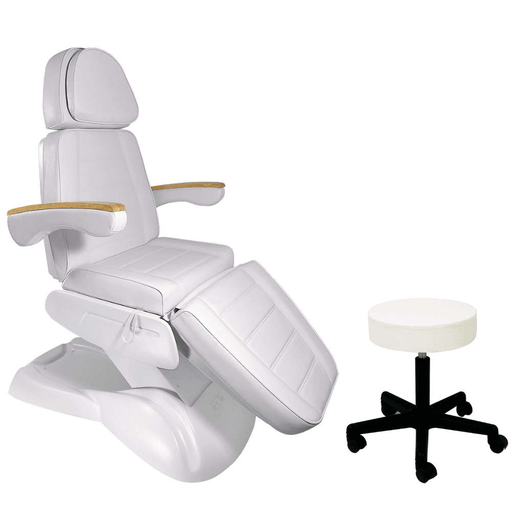 Fotel kosmetyczny elektryczny LUX 3 + taboret kosmetyczny BASIC 1 bez oparcia biały