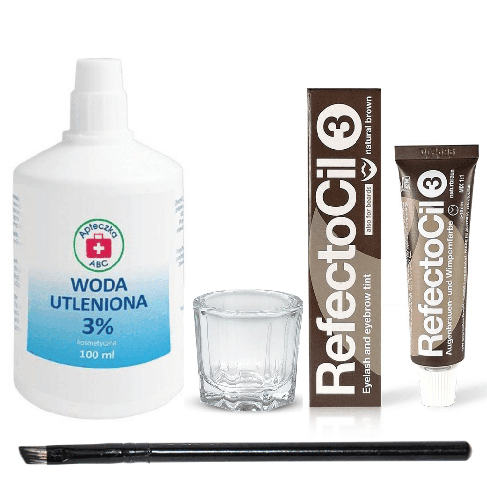 W zestawie: henna brązowa 15ml, woda utleniona 3%, pędzelek do henny, kieliszek do henny.