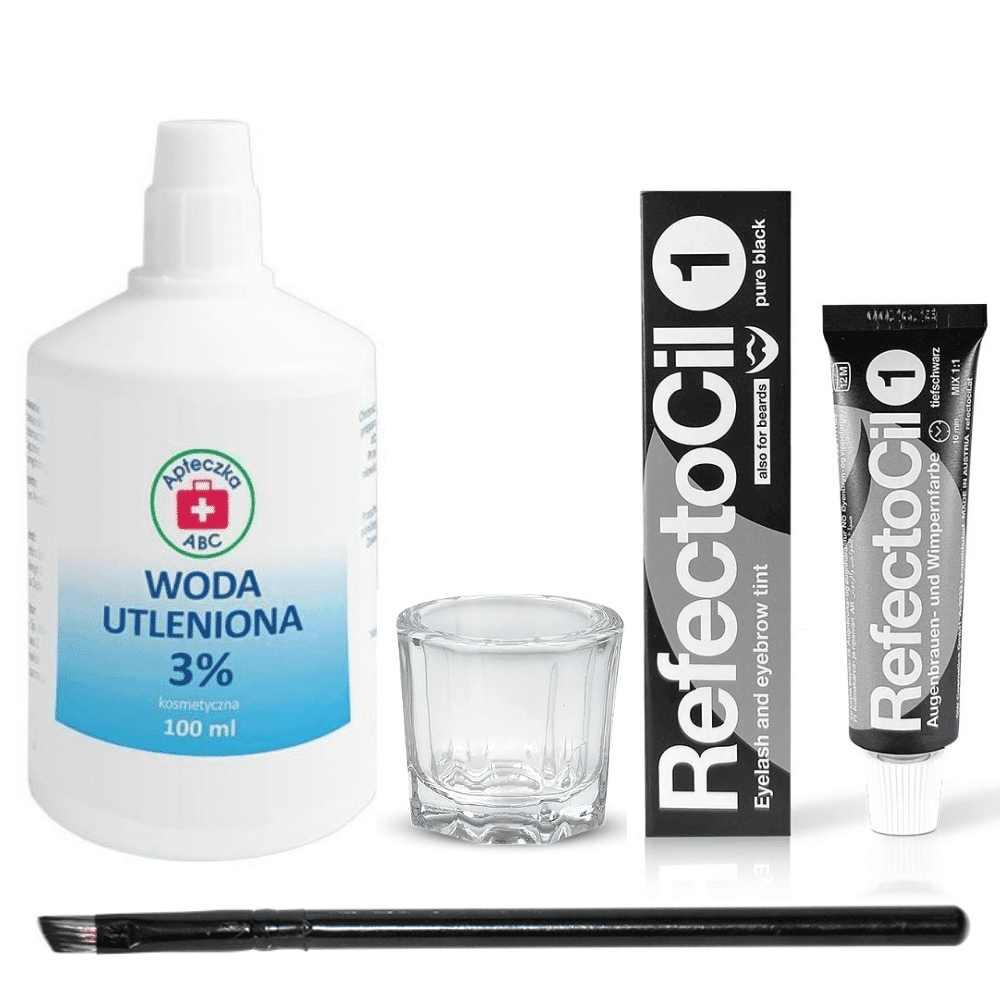 W zestawie: henna czarna 15ml, woda utleniona 3%, pędzelek do henny, kieliszek do henny.