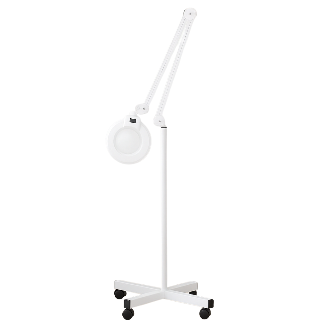 Urządzenie jest zamontowane na metalowym stelażu z solidną, stabilną podstawą na kółkach, co zapewnia mobilność i łatwość przemieszczania lampy. Ramię lampy pozwala na precyzyjne ustawienie kąta oświetlenia i lupy, dostosowując ją do indywidualnych potrzeb użytkownika.